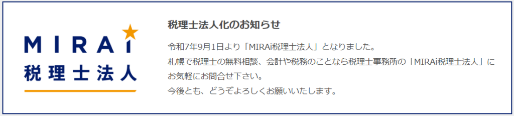 さっぽろ北24条会計事務所は「MIRAi税理士法人」に変わりました